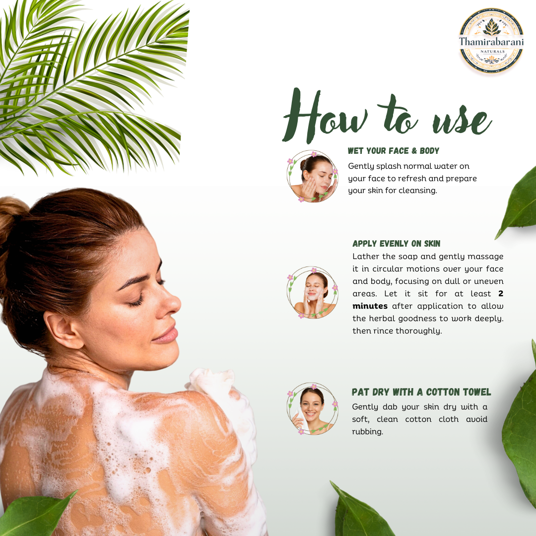 Wet your face & body. Massage the soap in circular motions. Leave for 2 minutes to absorb nutrients. Rinse & pat dry with a soft cotton towel
